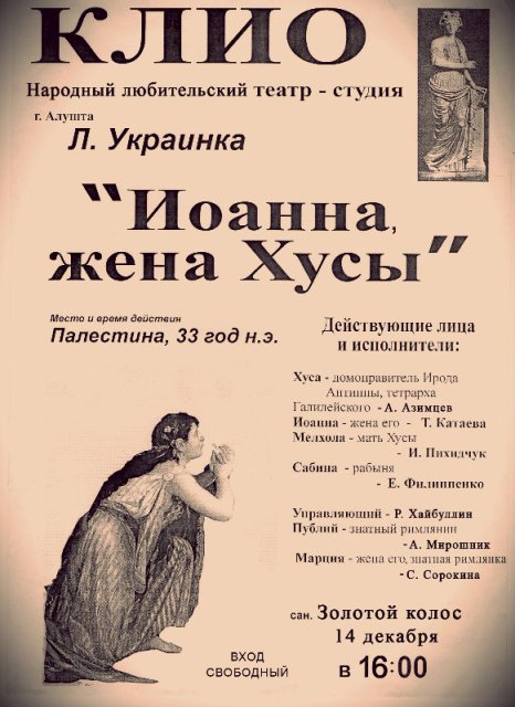 В воскресенье, 14 декабря, в курортном комплексе «Golden» состоится премьера спектакля «Иоанна, жена Хусы» по одноименной пьесе Леси Украинки.